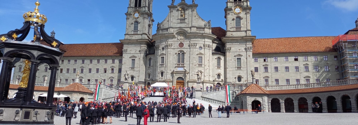 In seiner Predigt erläuterte uns Abt Urban den Ursprung der Fahnen als Orientierungspunkt der Soldaten im Kampf, deren Verlust schwerwiegende Folgen nach sich zog. So ist auch heute die Bedeutung der Fahne nicht nur ein Tuch mit schönen Farben, sondern ein Zeichen der Vision, einem Orientierungspunkt, «Mutmacherin auf eine Zukunft, die nicht die unsrige ist. In der es aber auch wahr sein wird, dass Gottes Ja allen gilt, immer, bis zum Ende der Zeit. In diese Zukunft fliegen die zwei Raben». Die Messe wurde musikalisch durch die festliche Barockmusik des Quintetto Inflagranti begleitet und umrahmt durch die vierzehn Fahnendelegationen aus dem Schweizerischen Studentenverein, die der GV Corvina mit ihrer Präsenz und dem Fahnengruss ihre Freundschaft bezeugten. Bei herrlichem Wetter zogen die Delegationen und Gäste aus der geöffneten Haupttüre der Klosterkirche und versammelten sich auf der grossen Treppe.