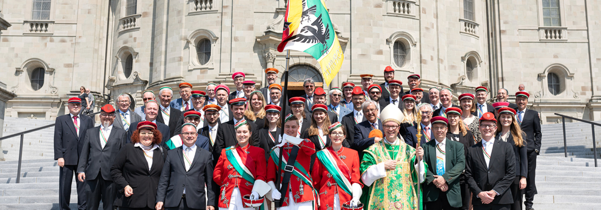In seiner Predigt erläuterte uns Abt Urban den Ursprung der Fahnen als Orientierungspunkt der Soldaten im Kampf, deren Verlust schwerwiegende Folgen nach sich zog. So ist auch heute die Bedeutung der Fahne nicht nur ein Tuch mit schönen Farben, sondern ein Zeichen der Vision, einem Orientierungspunkt, «Mutmacherin auf eine Zukunft, die nicht die unsrige ist. In der es aber auch wahr sein wird, dass Gottes Ja allen gilt, immer, bis zum Ende der Zeit. In diese Zukunft fliegen die zwei Raben». Die Messe wurde musikalisch durch die festliche Barockmusik des Quintetto Inflagranti begleitet und umrahmt durch die vierzehn Fahnendelegationen aus dem Schweizerischen Studentenverein, die der GV Corvina mit ihrer Präsenz und dem Fahnengruss ihre Freundschaft bezeugten. Bei herrlichem Wetter zogen die Delegationen und Gäste aus der geöffneten Haupttüre der Klosterkirche und versammelten sich auf der grossen Treppe.